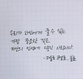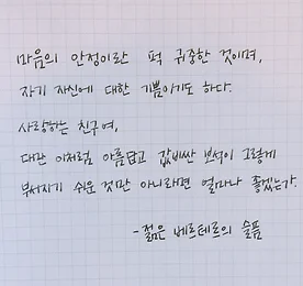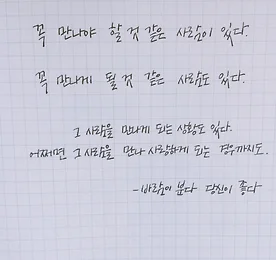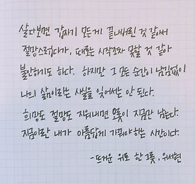 YOGORISM_/A Diary I Write To Show YOU 썸네일형 리스트형 [오늘의 사진 일기] 2024년 4월 5일 (금) 더보기 [손으로쓰다] 혼자의 발견, 곽정은 호감의 기술은 결코 복잡하지 않다. 그 누구도 하지 못했던 아름다운 질문을 건네는 것. 그리고 그 대답을 빛나는 눈으로 들어주는 것. -혼자의 발견, 곽정은 더보기 [손으로쓰다] 불륜, 파울로 코엘료 우리가 타인에게 줄 수 있는 가장 중요한 것은 자신의 인생에 담긴 사랑이다. -불륜, 파울로 코엘료 더보기 [손으로쓰다] 바람이 분다 당신이 좋다 꼭 만나야 할 것 같은 사람이 있다. 꼭 만나게 될 것 같은 사람도 있다. 그 사람을 만나게 되는 상황도 있다. 어쩌면 그 사람을 만나서 사랑하게 되는 경우까지도. -바람이 분다 당신이 좋다, 이병률 더보기 [손으로쓰다] 젊은 베르테르의 슬픔 마음의 안정이란 퍽 귀중한 것이며, 자기 자신에 대한 기쁨이기도 하다. 사랑하는 친구여, 다만 이처럼 아름답고 값비싼 보석이 그렇게 부서지기 쉬운 것만 아니라면 얼마나 좋겠는가. -젊은 베르테르의 슬픔 더보기 [손으로쓰다] 뜨거운 위로 한 그릇, 위서현 살다보면 갑자기 모든 게 끝나버린 것 같아서 절망스럽다가, 때로는 시작조차 못할 것 같아 불안하기도 하다. 하지만 그 모든 순간이 남김없이 나의 삶이라는 사실을 잊어서는 안 된다. 희망도 절망도 지워내면 오롯이 지금만 남는다. 지금이란 내가 아름답게 가꿔야하는 시간이다. -뜨거운 위로 한 그릇, 위서현 더보기 [손으로쓰다] 굿바이솔로 사람들은 사랑을 하지 못할 때는 사랑하고 싶어서, 사랑을 할 때는 그 사랑이 깨질까봐 늘 초조하도 불안하다. 그래서 지금 이 순간, 사랑하는 사람이 옆에 있어도 우리는 어리석게 외롭다. -굿바이 솔로 더보기 [손으로쓰다] 나는 나로 살기로 했다, 김수현 더이상 과거에 붙잡혀 살고 싶지 않다면 과거의 연약했전 나에게 위로를, 미성숙했던 그 모든 존재들에게 작별을 고해야 한다. -나는 나로 살기로 했다, 김수현 더보기 [손으로쓰다] 인생찬란 유구무언 인생은 생각한대로 흘러간다 간절히 꿈꾸고 애쓰면 언젠가 당신의 꿈은 이루어진다. -아, 인생찬란 유구무언 여기서의 포인트는 '애쓰면' 몹시 애써야한다는 것이 팁이로구나. 더보기 [손으로쓰다] 오늘 밤은 평화롭게 수 없이 많은 날 중에 그저 그런 날이 있죠시끄러운 이 하루만 지나면 괜찮을테니 오늘 밤은 평화롭게 오늘 밤은 울지 않게아무 근심 없이 아무 걱정 없이살며시 웃으며 잠들길편히 쉬어요 GOOD NIGHT - 오늘 밤은 평화롭게 / 데이브레이크(DAYBREAK)근래에 추천받아서 마인드 컨트롤 할 때 듣는 노래 중 하나.노래로 위로 받는 그런 저녁이 있지 않던가. 더보기 이전 1 2 3 4 다음