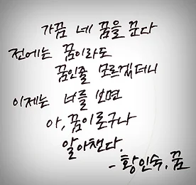 손글씨 썸네일형 리스트형 [손으로쓰다] 새해 복 많이 받으세요. *손으로 쓰는 일상 속의 단상斷想 새해 복 많이 받으세요. 듬뿍 담뿍 더보기 [손으로쓰다] 의미심장 in 고요는 도망가지 말아라 *손으로 쓰는 일상 속의 단상斷想 문학동네 시인선 051 고요는 도망가지 말아라 의미심장, 장석남 더보기 [손으로쓰다] 프로젝트 스며들다 12월, *손으로 쓰는 일상 속의 단상斷想 지난 나의 1년은 추억으로 남을까 기억으로 남을까 향기로 남을까 냄새로 남을까 - 2014 DEC 프로젝트 스며들다 instagram : p_permeating facebook.com/permeating 더보기 [손으로쓰다] *손으로 쓰는 일상 속의 단상斷想 머물러라, 너는 정말 아름답구나 -파우스트 힘들기만 한 일이면 그만두세요. 힘든만큼 값어치 있다면 계속하세요. 더보기 [손으로쓰다] DoNotHesitate *손으로 쓰는 일상 속의 단상斷想 #DoNotHesitate 그 어떤 것 앞에서도. 더보기 연습 어제, 간만에 물붓으로 글씨를 써 보았다. 내키는대로. (캘리는 언제쯤 배울 수 있을까) 그러다가 내가 좋아하는 크루 이름으로 연습한 것 들. 2주마다 다 함께 뛰는 러닝 크루 모임이 있다. 합정, 상수를 기반으로 하는 "RunSeoul (런서울)" 16번째 러닝이 이번 주에 있으며, 나는 10월 3일부터 현재까지 3회 참여했으니 런서울에서는 꼬꼬마 런서울 러너인 셈. 기왕 런서울 얘기가 나왔으니 런서울 금주 정규런 홍보글을 옮겨본다. 16th RUN! crewlove, Runseoul 의 열여섯번째 Running! 1) 이번 주 금요일, 저녁 8시 15분 2) 장소는 상수역 할리스 커피 앞 3) 준비물은 건강한 몸과 마음 4) 코스는 6km, 시끄러운 홍대 일대. 5) 누구나 참여.. 더보기 [손으로쓰다] 매달린 절벽에서 손을 뗄 수 있는가 *손으로 쓰는 일상 속의 단상斷想 매달린 절벽에서 손을 뗄 수 있는가, 강신주 저 친구에게 소개받고 제목도 문구 일부도 맘에 들어서 받아 적아놓은 상태. 곧, 읽어봐야지. 강신주 횽아는 옳다. 옳아. 한마디 한마디 사람 울리는 기술이 있음. 더보기 [손으로쓰다] 잊을 수 없는 순간, the moments *손으로 쓰는 일상 속의 단상斷想 평범한 일상이 잊지 못 할 순간, 이 될 수도 있는 것을 보면 어쩌면 우리에게 하찮은 순간 순간은 없을지도 모르겠다. 그리고 그 순간 순간 속의 대화들과 작은 몸짓 하나도 그 잊을 수 없는 순간과 함께 마음에 아로새겨지는 듯 하다. 진하게. 10월 11일 토요일 새벽 그 날, 그 순간, 그 순간의 호흡, 그 순간의 박동수, 그 순간의 공기를 잊을 수가 없다. 내가 어디있든 무얼하든 잊지 않을 아니 잊혀질 수 없는 순간. :) 누구에게나 잊을 수 없는 순간은 있다. 더보기 [손으로쓰다] 꿈 *손으로 쓰는 일상 속의 단상斷想 황인숙, 꿈 꿈이 아니라 현실에서 봐도 꿈 같은, 더보기 [손으로쓰다] 순간들에게 *손으로 쓰는 일상 속의 단상 순간들에게 아쉬움을 남기지 맙시다. 그러하겠노라고 매 순간 최선을 다하겠노라고 오늘도 나는 다짐을 하고 또 행동으로 옮기고 있지 언젠가는 누군가는 알아줄지 모르고 알아주지 않아도 나는 순간들에게 최선을 다할테다. 어느 날 너는 그렇게 내게 다가왔다 더보기 이전 1 2 3 다음