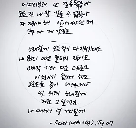 손으로쓰는일상속의단상 썸네일형 리스트형 [손으로쓰다] TOY 07 *손으로 쓰는 일상 속의 단상斷想 1. 2번 트랙인, Reset (w/ 이적) 개인적으로 가사가 제일 맘에 드는 곡. 18일에 이 앨범 풀리자마자 불 끄고 누워서 듣다가 너무 좋아서 불 켜고 일어나서 받아쓰기 했음. 아 좋아. 노래할게 모든 것이 다 지워진대도 2. 4번 트랙인, 세 사람 (w/ 성시경) 토이 7집의 타이틀 곡. 오 마이 러브, 오 나의 사랑 오 나의 태양 시경님. 멜로디는 밝은데 가사는 슬픔. 노래만 얼핏 들으면 기분 좋은 노래 같지만 가사에 조금만 집중해도 그냥 눈물 또르르. 3. 세 사람 가사 중에 맘에 들었던 부분. 7년만에 나온 토이 7집, 예전보다 밝아진 기분이고 여성 라인업이 눈에 띄는 것이 특징이라면 특징. 난 아직 불만없이 잘 듣고 있음. :) 더보기 연습 어제, 간만에 물붓으로 글씨를 써 보았다. 내키는대로. (캘리는 언제쯤 배울 수 있을까) 그러다가 내가 좋아하는 크루 이름으로 연습한 것 들. 2주마다 다 함께 뛰는 러닝 크루 모임이 있다. 합정, 상수를 기반으로 하는 "RunSeoul (런서울)" 16번째 러닝이 이번 주에 있으며, 나는 10월 3일부터 현재까지 3회 참여했으니 런서울에서는 꼬꼬마 런서울 러너인 셈. 기왕 런서울 얘기가 나왔으니 런서울 금주 정규런 홍보글을 옮겨본다. 16th RUN! crewlove, Runseoul 의 열여섯번째 Running! 1) 이번 주 금요일, 저녁 8시 15분 2) 장소는 상수역 할리스 커피 앞 3) 준비물은 건강한 몸과 마음 4) 코스는 6km, 시끄러운 홍대 일대. 5) 누구나 참여.. 더보기 [손으로쓰다] 매달린 절벽에서 손을 뗄 수 있는가 *손으로 쓰는 일상 속의 단상斷想 매달린 절벽에서 손을 뗄 수 있는가, 강신주 저 친구에게 소개받고 제목도 문구 일부도 맘에 들어서 받아 적아놓은 상태. 곧, 읽어봐야지. 강신주 횽아는 옳다. 옳아. 한마디 한마디 사람 울리는 기술이 있음. 더보기 [손으로쓰다] 잊을 수 없는 순간, the moments *손으로 쓰는 일상 속의 단상斷想 평범한 일상이 잊지 못 할 순간, 이 될 수도 있는 것을 보면 어쩌면 우리에게 하찮은 순간 순간은 없을지도 모르겠다. 그리고 그 순간 순간 속의 대화들과 작은 몸짓 하나도 그 잊을 수 없는 순간과 함께 마음에 아로새겨지는 듯 하다. 진하게. 10월 11일 토요일 새벽 그 날, 그 순간, 그 순간의 호흡, 그 순간의 박동수, 그 순간의 공기를 잊을 수가 없다. 내가 어디있든 무얼하든 잊지 않을 아니 잊혀질 수 없는 순간. :) 누구에게나 잊을 수 없는 순간은 있다. 더보기 [손으로쓰다] 꿈 *손으로 쓰는 일상 속의 단상斷想 황인숙, 꿈 꿈이 아니라 현실에서 봐도 꿈 같은, 더보기 [손으로쓰다] 순간들에게 *손으로 쓰는 일상 속의 단상 순간들에게 아쉬움을 남기지 맙시다. 그러하겠노라고 매 순간 최선을 다하겠노라고 오늘도 나는 다짐을 하고 또 행동으로 옮기고 있지 언젠가는 누군가는 알아줄지 모르고 알아주지 않아도 나는 순간들에게 최선을 다할테다. 어느 날 너는 그렇게 내게 다가왔다 더보기 이전 1 다음